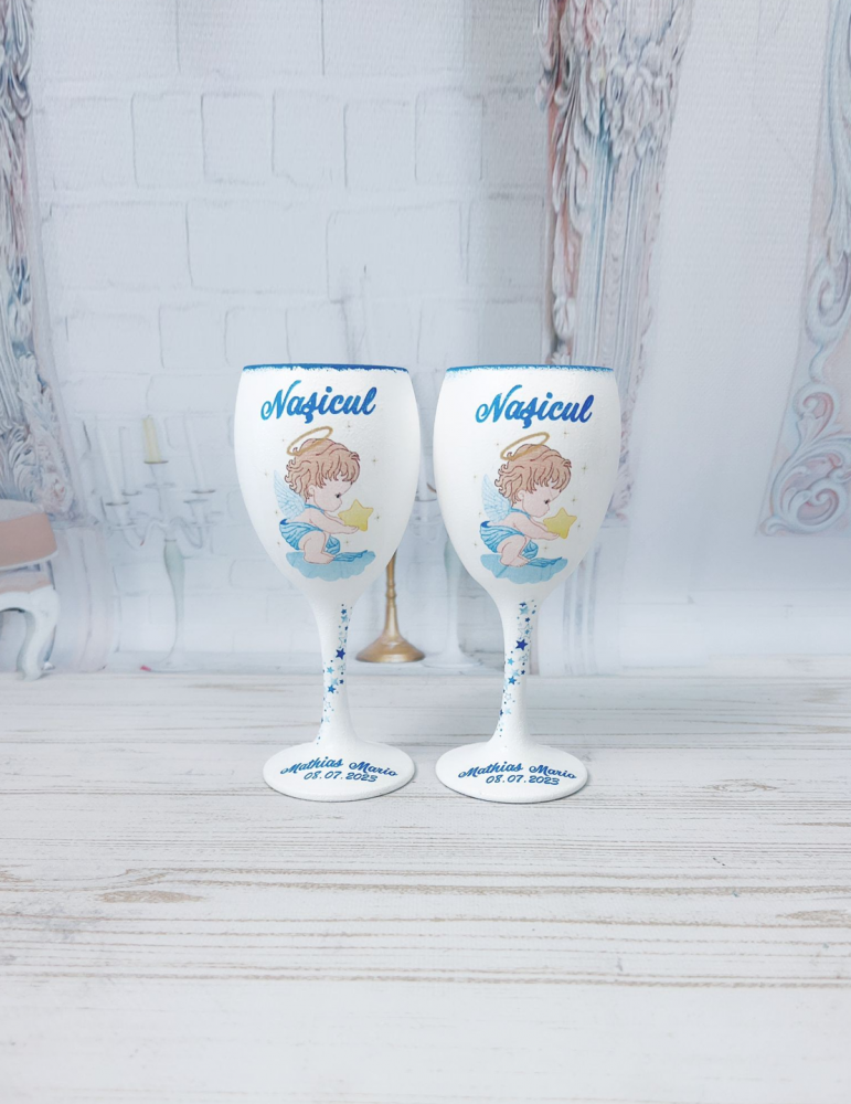 Alege pahare de botez unice, realizate manual prin tehnica decoupage, cu produse NON TOXICE, rezistente la spalare repetata. Fiecare pahar este personalizat tematic, perfect pentru parinti, nasi si copii, aducand un plus de rafinament evenimentului tau special.