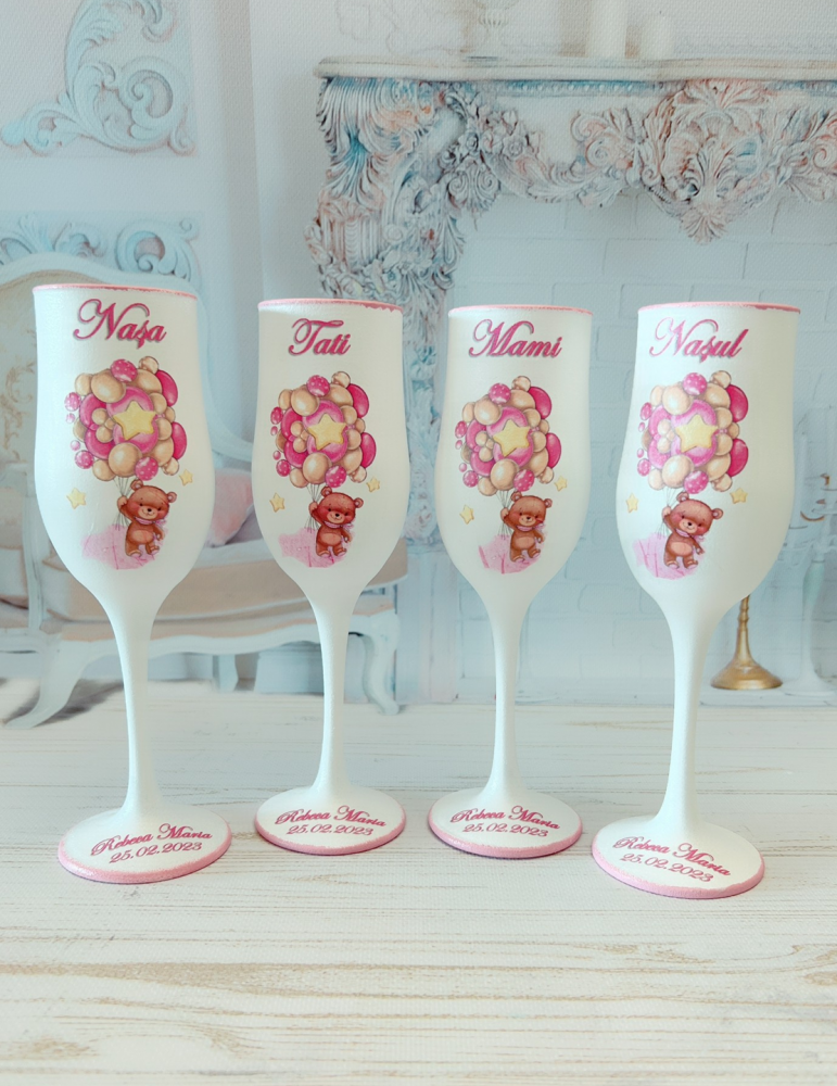 Pahare de botez personalizate pentru parinti si nasi cu ursulet roz