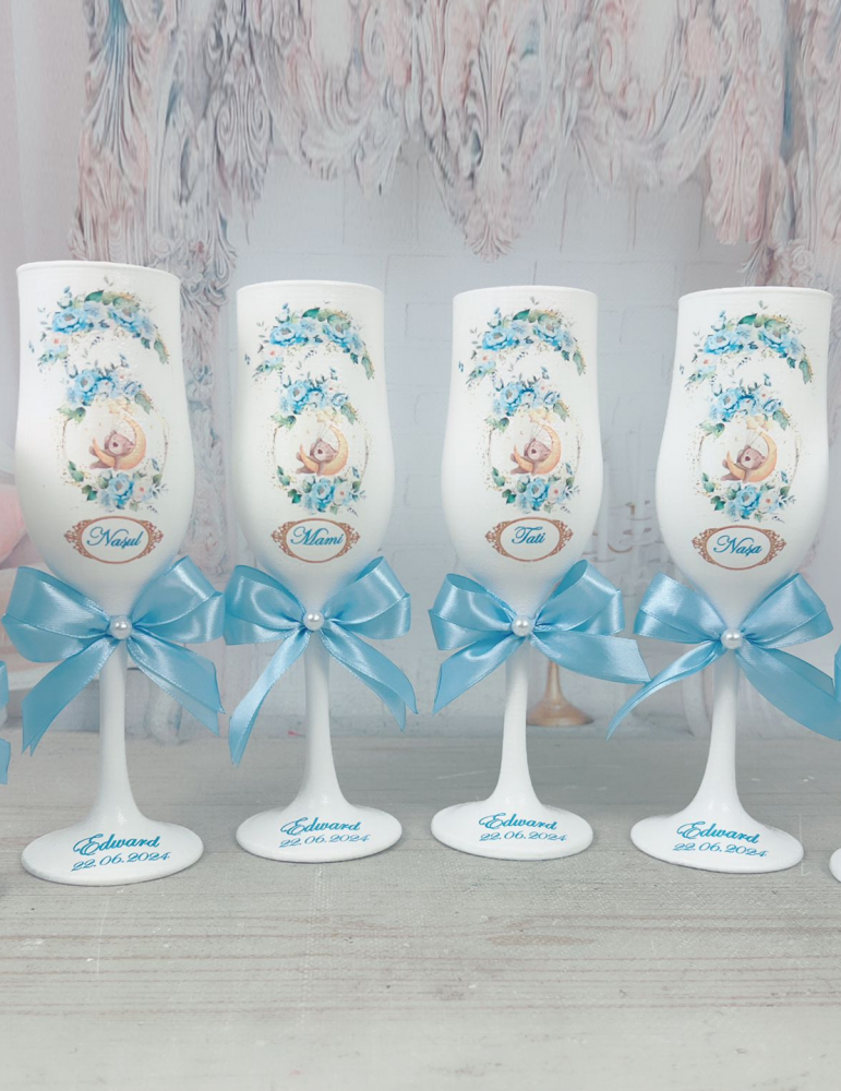 Alege pahare de botez unice, realizate manual prin tehnica decoupage, cu produse NON TOXICE, rezistente la spalare repetata. Fiecare pahar este personalizat tematic, perfect pentru parinti, nasi si copii, aducand un plus de rafinament evenimentului tau special.