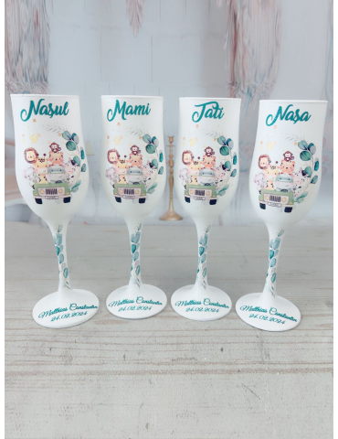 Alege pahare de botez unice, realizate manual prin tehnica decoupage, cu produse NON TOXICE, rezistente la spalare repetata. Fiecare pahar este personalizat tematic, perfect pentru parinti, nasi si copii, aducand un plus de rafinament evenimentului tau special.