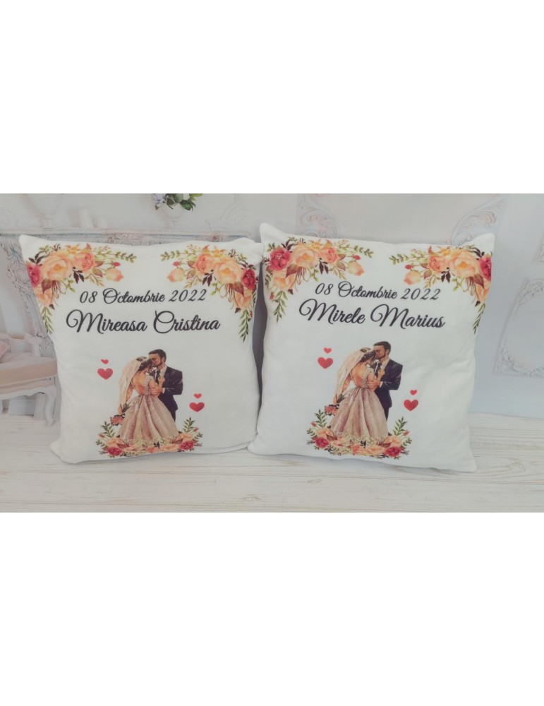 Pretul afisat se refera la o singura perna si include personalizarea cu nume miri, data eveniment, mesaj preferat.