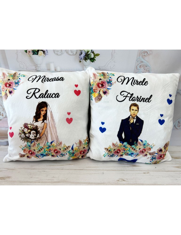 Pretul afisat se refera la o singura perna si include personalizarea cu nume miri, data eveniment, mesaj preferat. - Dimensiune perna de nunta