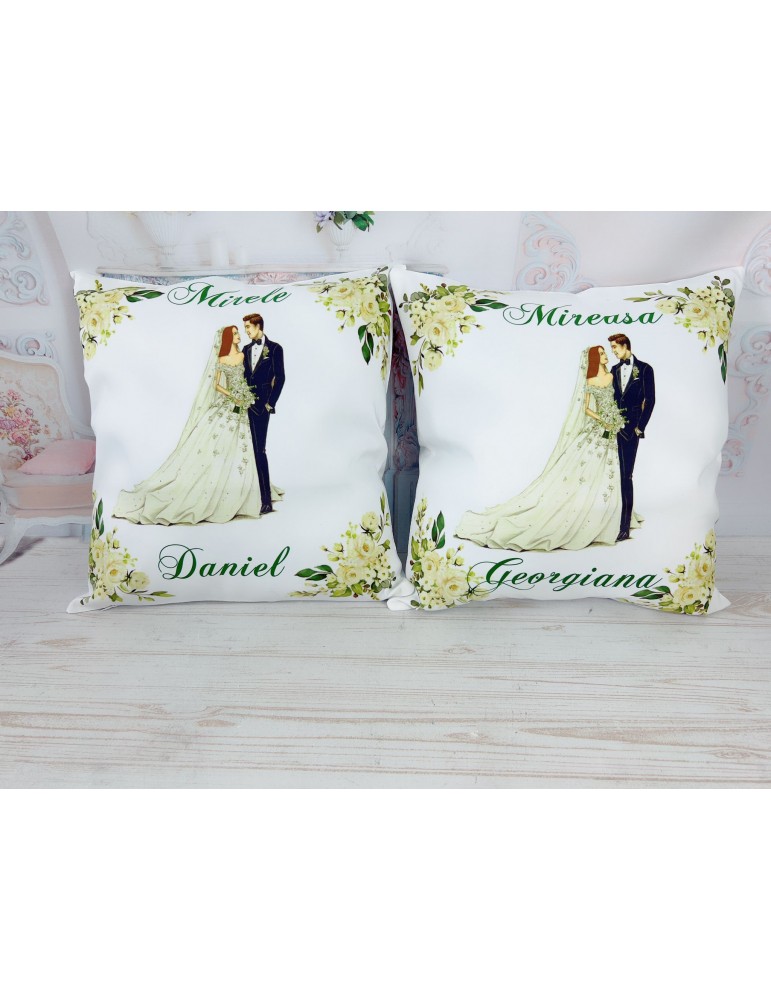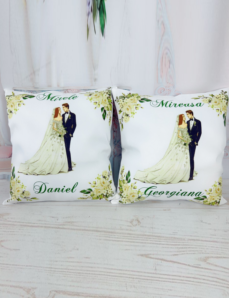 Pretul afisat se refera la o singura perna si include personalizarea cu nume miri, data eveniment, mesaj preferat. - Dimensiune perna de nunta