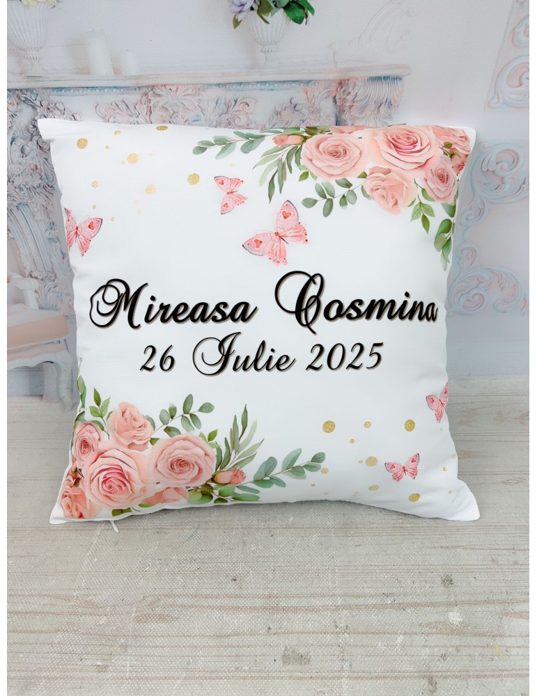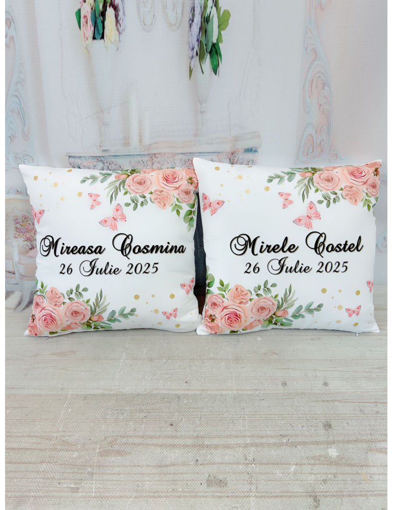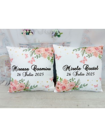 Pretul afisat se refera la o singura perna si include personalizarea cu nume miri, data eveniment, mesaj preferat.