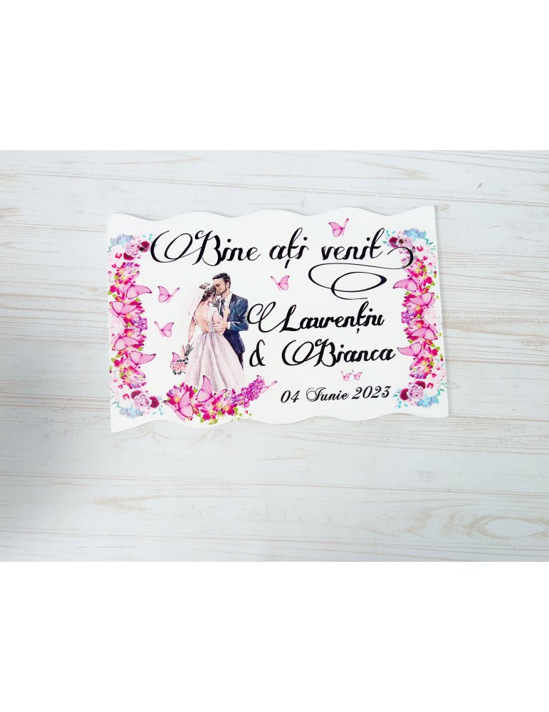 Pretul se refera la o singura placuta bine ati venit si include personalizarea cu numele mirilor si data evenimentului