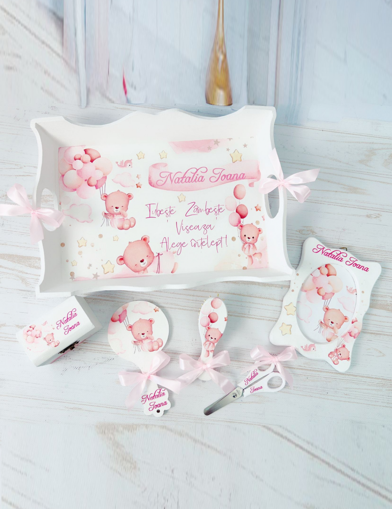 6 elemente: tavita, perie, oglinda, rama foto, cutiuta suvite, forfecuta