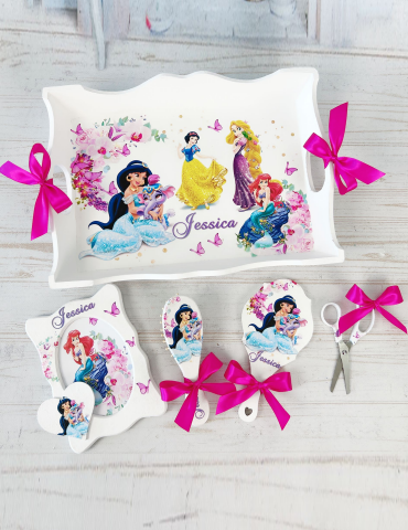 - 6 elemente: tavita, perie, oglinda, rama foto, cutiuta suvite, forfecuta