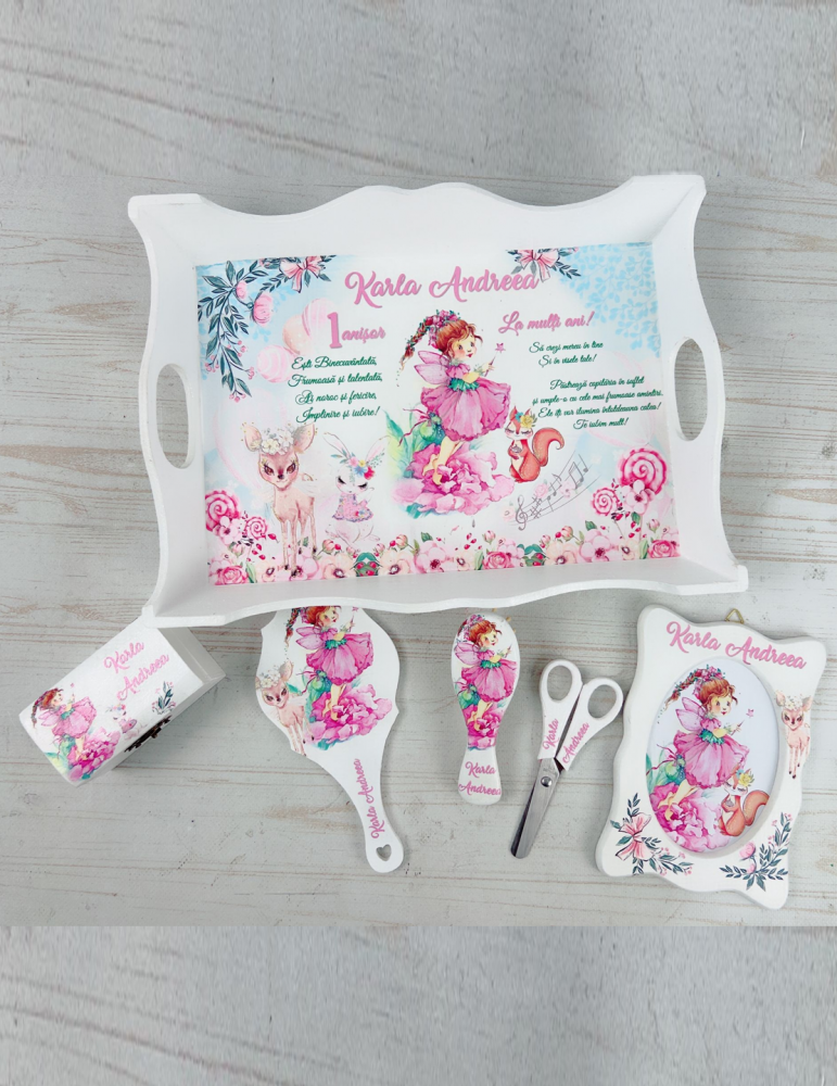 - 6 elemente: tavita, perie, oglinda, rama foto, cutiuta suvite, forfecuta