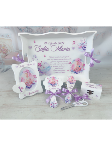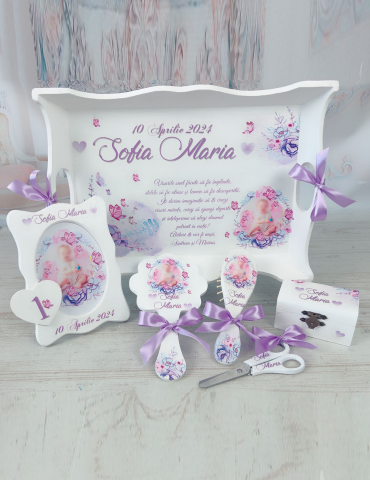 - 6 elemente: tavita, perie, oglinda, rama foto, cutiuta suvite, forfecuta