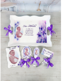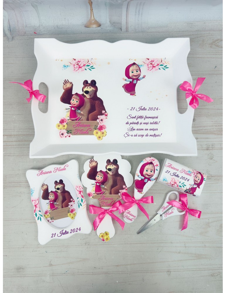 - 6 elemente: tavita, perie, oglinda, rama foto, cutiuta suvite, forfecuta