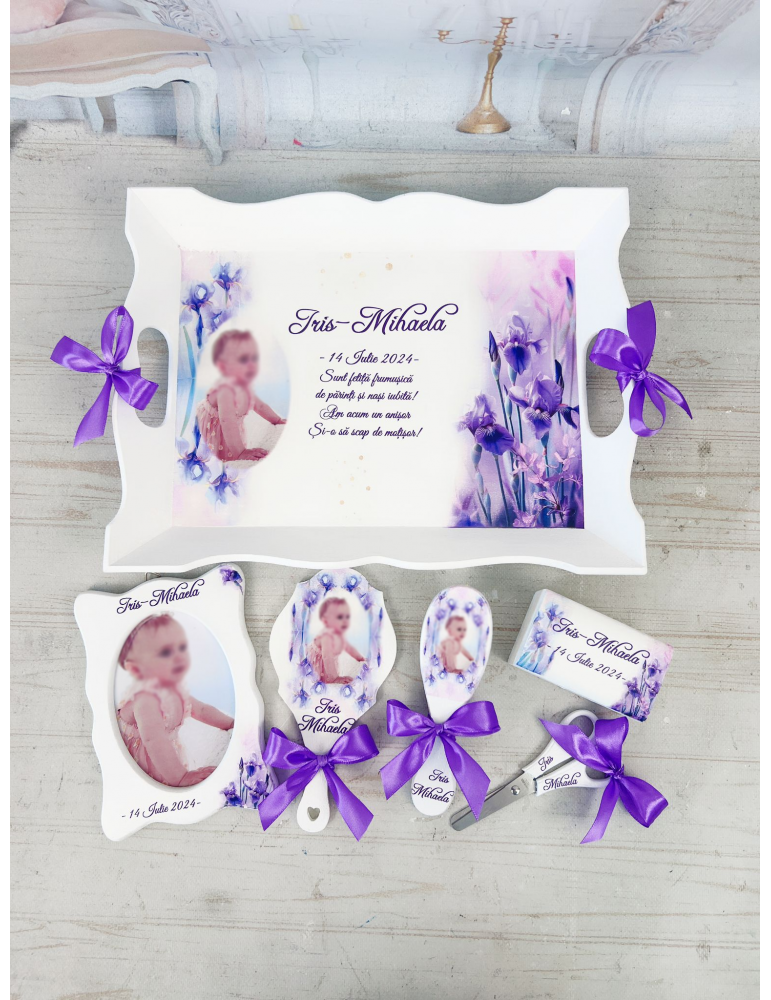 6 elemente: tavita, perie, oglinda, rama foto, cutiuta suvite, forfecuta