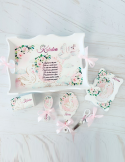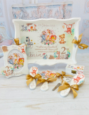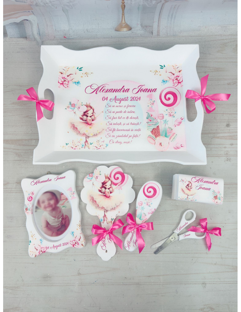 - 6 elemente: tavita, perie, oglinda, rama foto, cutiuta suvite, forfecuta