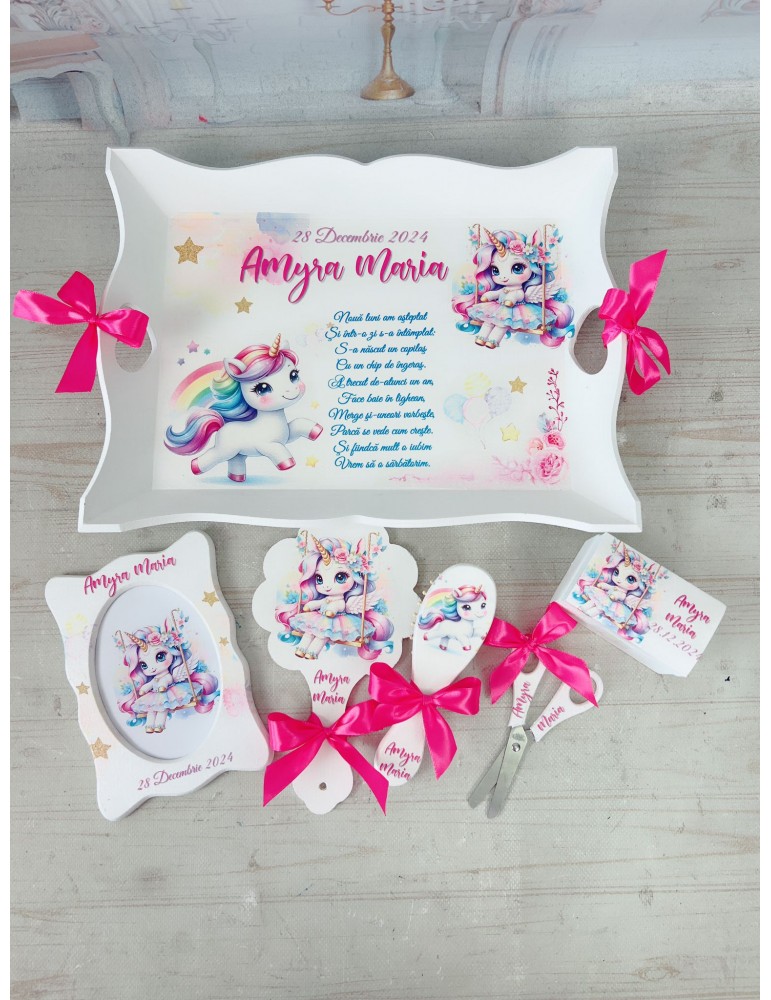 - 6 elemente: tavita, perie, oglinda, rama foto, cutiuta suvite, forfecuta