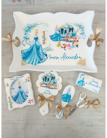 - 6 elemente: tavita, perie, oglinda, rama foto, cutiuta suvite, forfecuta