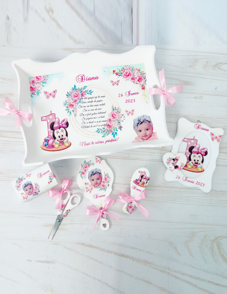 - 6 elemente: tavita, perie, oglinda, rama foto, cutiuta suvite, forfecuta