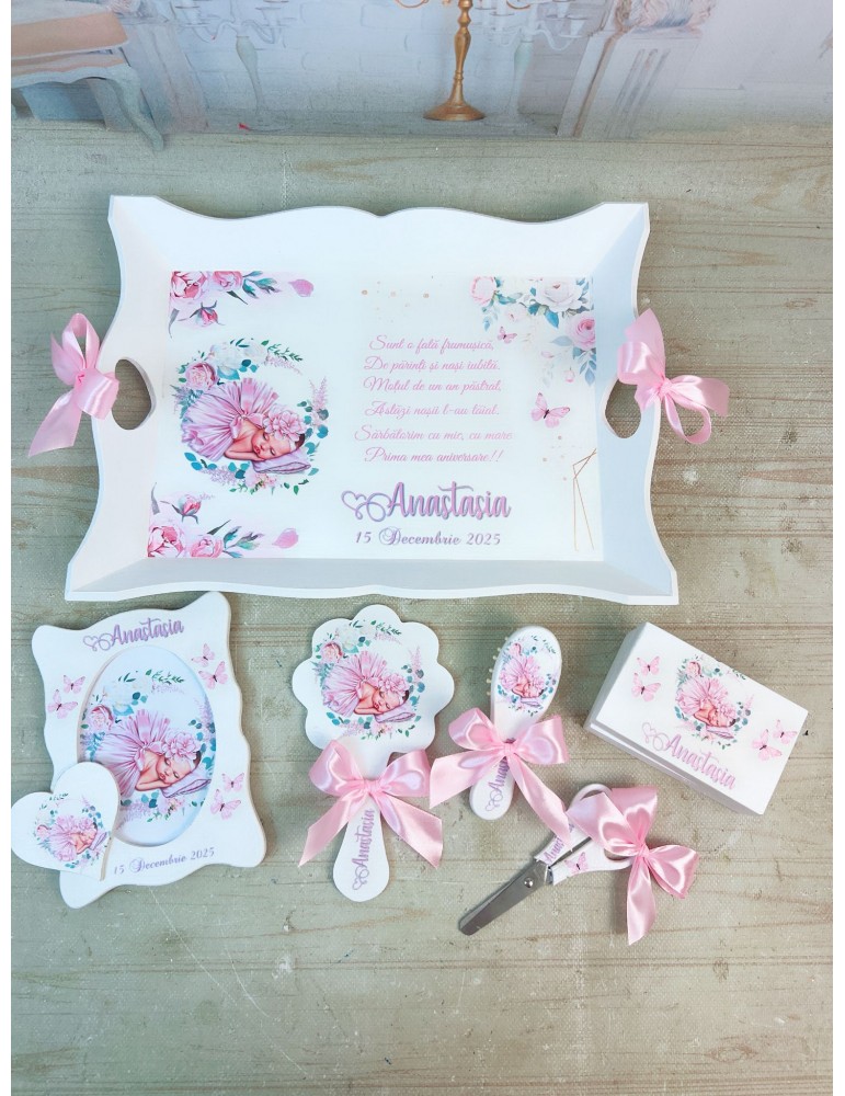- 6 elemente: tavita, perie, oglinda, rama foto, cutiuta suvite, forfecuta