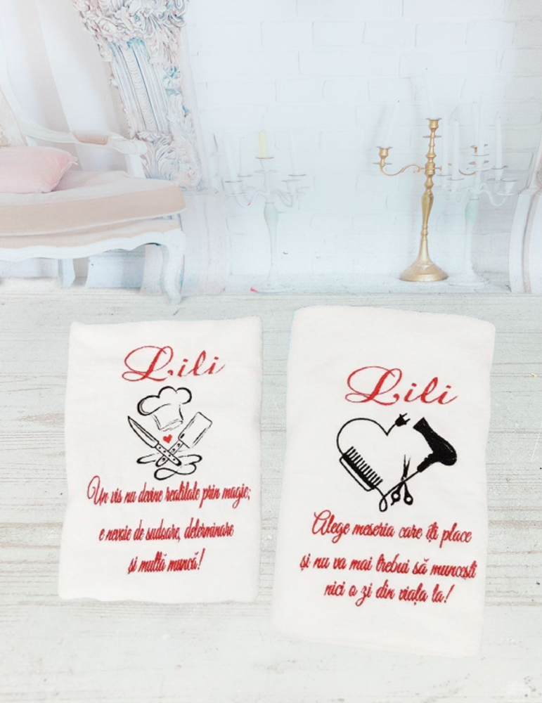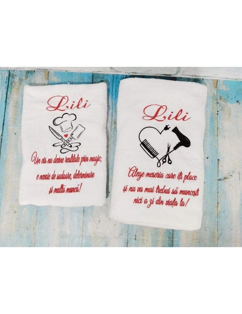 * Pretul este pentru un set de 2 prosoape si include brodarea urmatoarelor elemente: personaje/motive florale, prenume bebelus, data eveniment, eventuale citate.