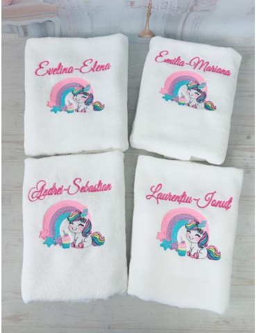 * Pretul este pentru un set de 2 prosoape si include brodarea urmatoarelor elemente: personaje/motive florale, prenume bebelus, data eveniment, eventuale citate.