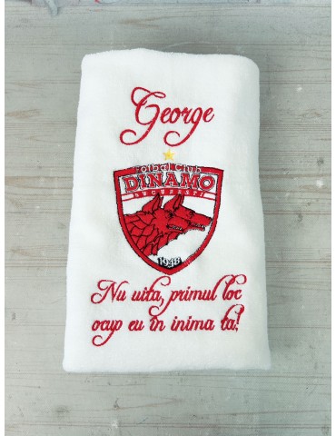 Descopera cadoul perfect pentru un dinamovist cu acest prosop 100% din bumbac, personalizat cu logo-ul Dinamo si numele sau mesajul preferat al suporterului. Personalizarea se realizeaza prin broderie de inalta calitate, rezistenta in timp, chiar si dupa multiple spalari, mentinand cadoul pentru suporterul Dinamo impecabil.