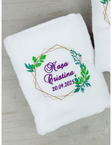 Surprinde-ți nașii de cununie cu un cadou deosebit și memorabil: prosoape din bumbac 100%, personalizate prin broderie cu numele mirilor, ale finilor și data evenimentului. Fiecare prosop este realizat cu grijă și atenție la detalii, devenind o amintire practică și elegantă de la cea mai importantă zi. Prosoapele sunt prezentate într-o cutie de carton elegantă, potrivită pentru a fi oferită direct cadou în ziua nuntii.