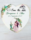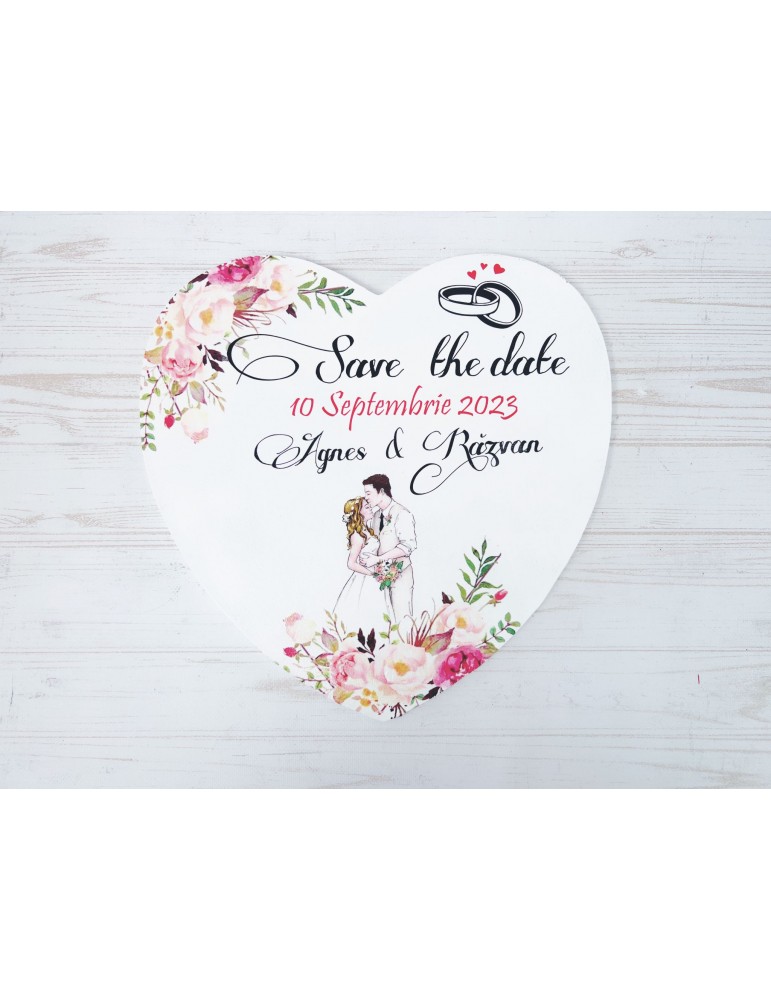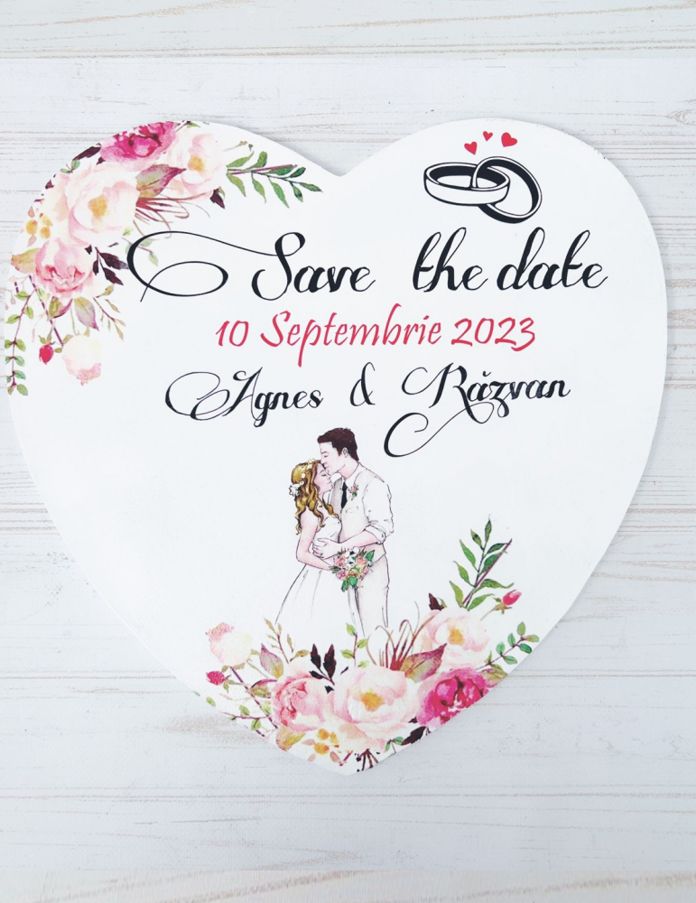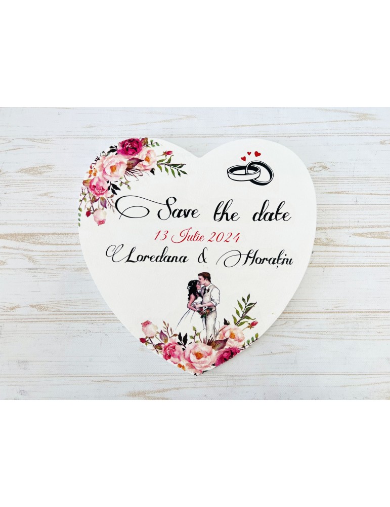 Placuta save the date din lemn personalizata cu bujori