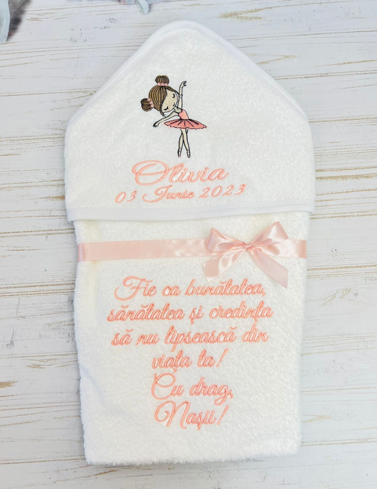 Prosop personalizat pentru băița de a doua zi, cu balerina brodat și text la alegere – un cadou de suflet pentru cel mic. Realizat din bumbac moale și absorbant, acest prosop este ideal pentru tradiția băiței de a doua zi, oferind un plus de emoție și eleganță momentului. Broderia cu balerina și numele bebelușului transformă acest produs într-o amintire prețioasă. Potrivit ca dar din partea nașilor sau a părinților, prosopul personalizat este atât practic, cât și simbolic.