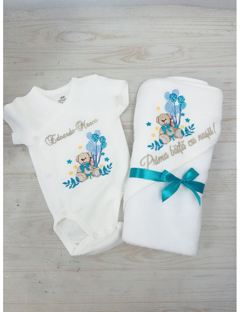 Setul este compus din body cu maneca lunga sau scurta (in functie de sezon)+prosop cu capison personalizat cu mesaj scurt, desen  si nume copil.