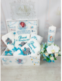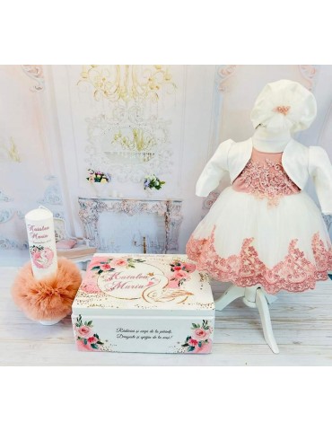 Pretul afisat se refera la setul de botez ce include: cutie amintiri, trusou brodat, lumanare de botez - personalizarea este inclusa in pret - Diametru lumanare botez