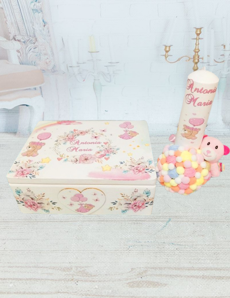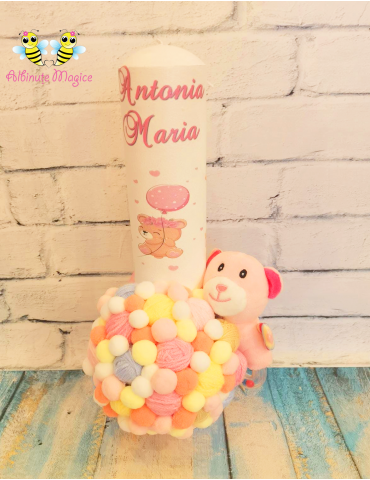 Lumanarea de botez este decorată elegant cu gheme colorate, asortată cu grafica cutiei, și poate include: