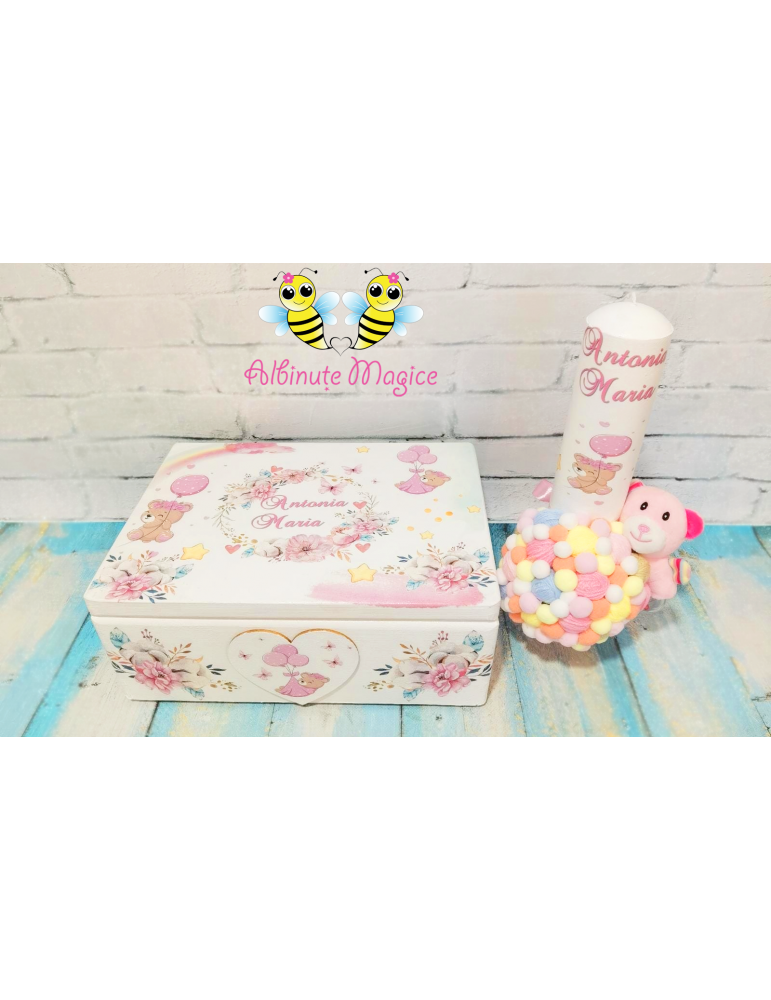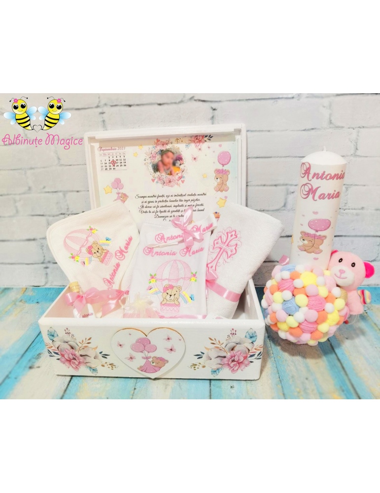 Pretul afisat se refera la setul de botez ce include: cutie amintiri, trusou brodat, lumanare de botez - personalizarea este inclusa in pret