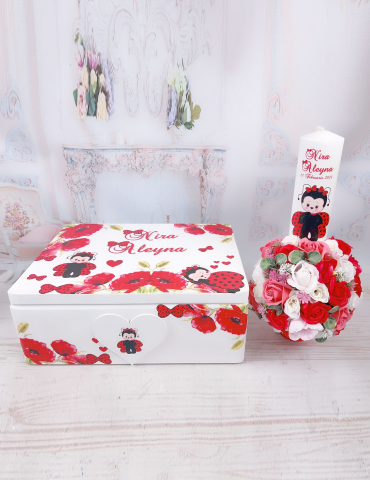 Lucrată manual din lemn, cutia este vopsită, lacuită în trei straturi pentru rezistență în timp și decorată cu grafica personalizată folosind tehnica decoupage. Personalizarea cutiei poate include:
