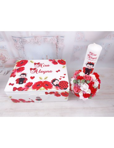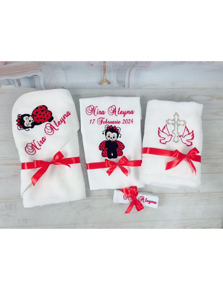 Trusou botez brodat fetita buburuza si lumanare botez personalizata