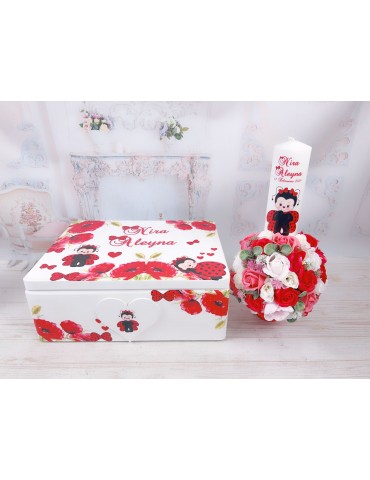 Pretul afisat se refera la setul de botez ce include: cutie amintiri, trusou brodat, lumanare de botez - personalizarea este inclusa in pret - Diametru lumanare botez