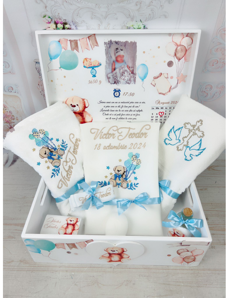 Pretul afisat se refera la setul de botez ce include: cutie amintiri, trusou brodat, lumanare de botez - personalizarea este inclusa in pret
