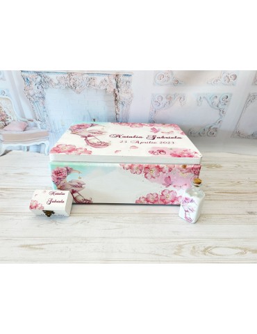 Lucrată manual din lemn, cutia este vopsită, lacuită în trei straturi pentru rezistență în timp și decorată cu grafica personalizată folosind tehnica decoupage. Personalizarea cutiei poate include: