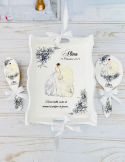Acest set gatit mireasa este ideal pentru pregatirea miresei inainte de cununia religioasa si reprezinta un cadou traditional din partea nasei. Setul este perfect pentru poze, aducand un aer elegant si rafinat in momentele speciale ale zilei tale. Datorita procesului de productie manuala, fiecare set este unic si special, oferind o valoare deosebita oricarui eveniment de nunta sau cununie.