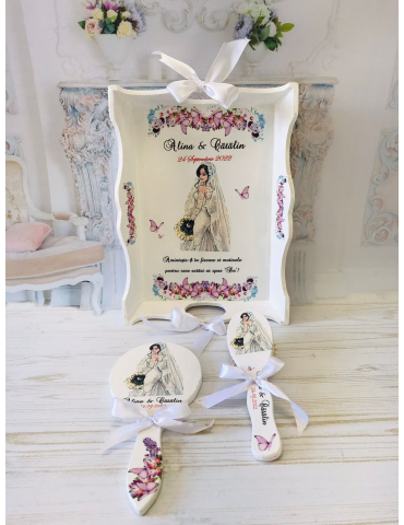 Descopera Setul Gatit Mireasa personalizat, un cadou unic si elegant, perfect pentru orice mireasa. Complet realizat manual in atelierul nostru, acest set este compus din trei piese esentiale: o tava, o oglinda de mana si o perie,  toate fabricate din lemn sau MDF de cea mai buna calitate. Fiecare piesa este vopsita si lacuita manual cu mare atentie la detalii, folosind vopsea acrilica non-toxica pe baza de apa si lac rezistent, garantand astfel durabilitatea si un finisaj impecabil.