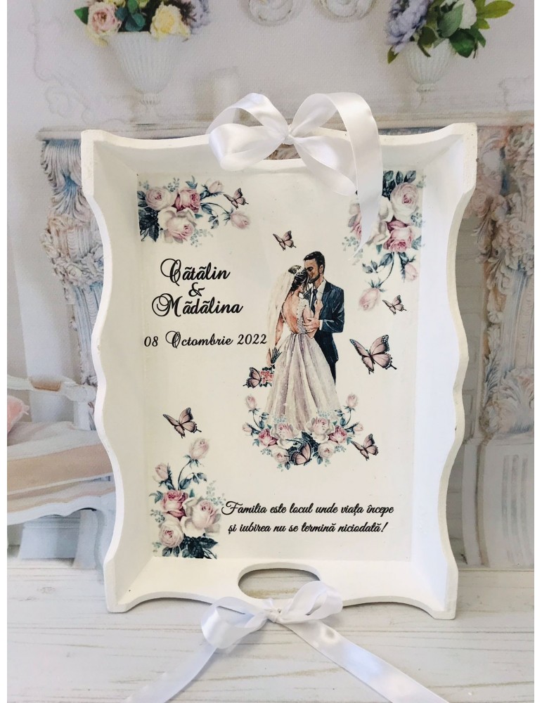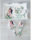 Descopera Setul de gatit mireasa personalizat, un cadou unic si elegant, perfect pentru orice mireasa. Complet realizat manual in atelierul nostru, acest set este compus din trei piese esentiale: o tava, o oglinda de mana si o perie, toate fabricate din lemn sau MDF de cea mai buna calitate. Fiecare piesa este vopsita si lacuita manual cu mare atentie la detalii, folosind vopsea acrilica non-toxica pe baza de apa si lac rezistent, garantand astfel durabilitatea si un finisaj impecabil.