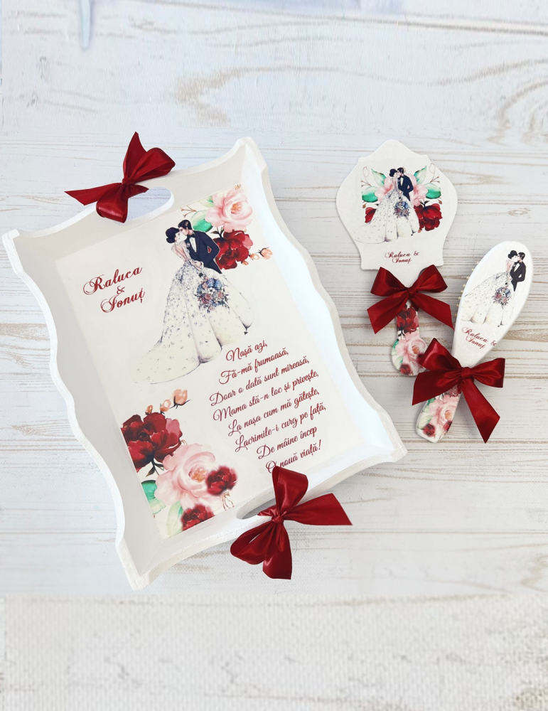 Descopera Setul Gatit Mireasa personalizat, un cadou unic si elegant, perfect pentru orice mireasa. Complet realizat manual in atelierul nostru, acest set este compus din trei piese esentiale: o tava, o oglinda de mana si o perie, toate fabricate din lemn sau MDF de cea mai buna calitate. Fiecare piesa este vopsita si lacuita manual cu mare atentie la detalii, folosind vopsea acrilica non-toxica pe baza de apa si lac rezistent, garantand astfel durabilitatea si un finisaj impecabil.
