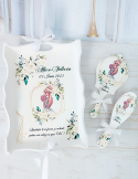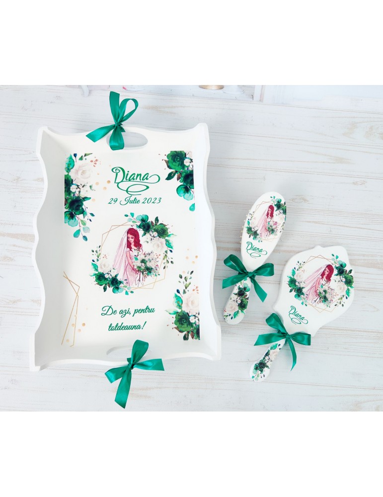 Descopera Setul Gatit Mireasa personalizat, un cadou unic si elegant, perfect pentru orice mireasa. Complet realizat manual in atelierul nostru, acest set este compus din trei piese esentiale: o tava, o oglinda de mana si o perie,  toate fabricate din lemn sau MDF de cea mai buna calitate. Fiecare piesa este vopsita si lacuita manual cu mare atentie la detalii, folosind vopsea acrilica non-toxica pe baza de apa si lac rezistent, garantand astfel durabilitatea si un finisaj impecabil.