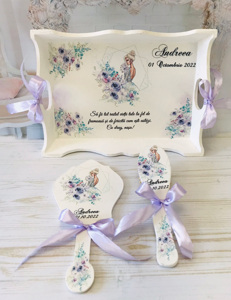 Descopera Setul Gatit Mireasa personalizat, un cadou unic si elegant, perfect pentru orice mireasa. Complet realizat manual in atelierul nostru, acest set este compus din trei piese esentiale: o tava, o oglinda de mana si o perie,  toate fabricate din lemn sau MDF de cea mai buna calitate. Fiecare piesa este vopsita si lacuita manual cu mare atentie la detalii, folosind vopsea acrilica non-toxica pe baza de apa si lac rezistent, garantand astfel durabilitatea si un finisaj impecabil.