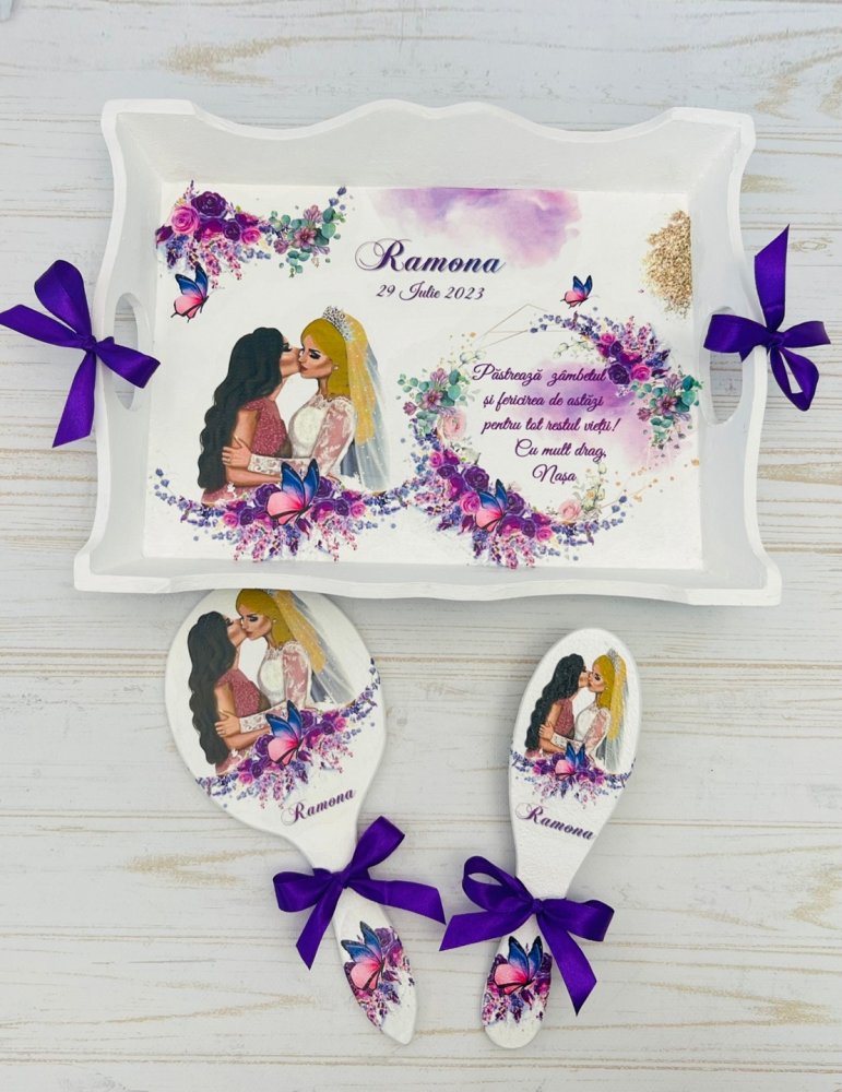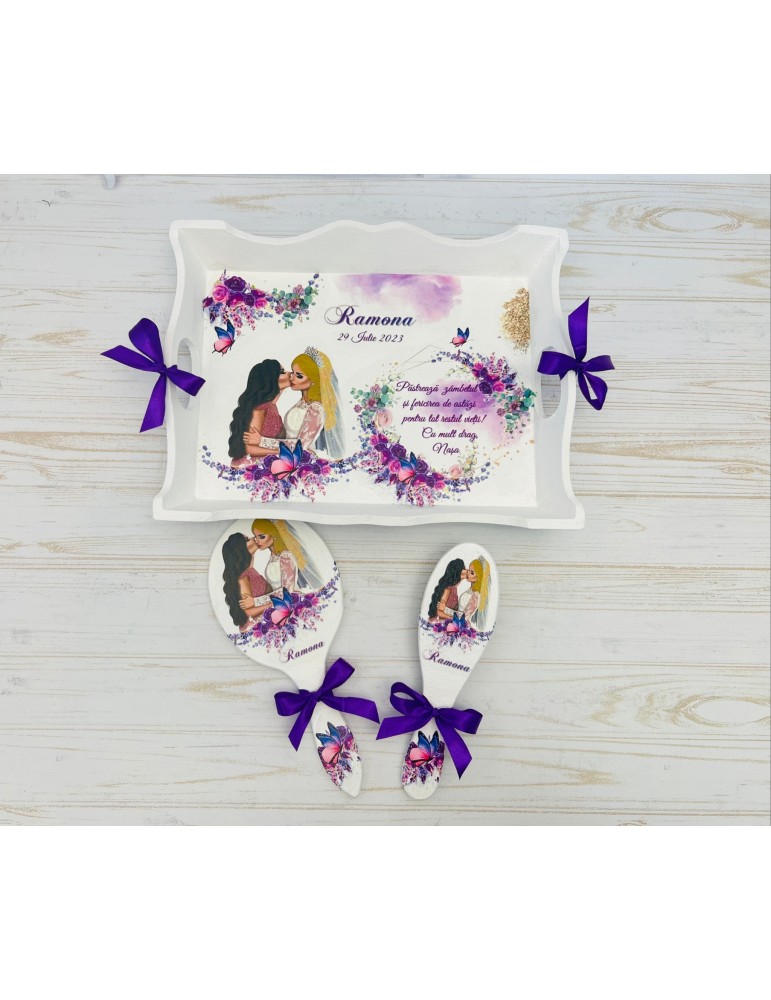 Descopera Setul Gatit Mireasa personalizat, un cadou unic si elegant, perfect pentru orice mireasa. Complet realizat manual in atelierul nostru, acest set este compus din trei piese esentiale: o tava, o oglinda de mana si o perie,  toate fabricate din lemn sau MDF de cea mai buna calitate. Fiecare piesa este vopsita si lacuita manual cu mare atentie la detalii, folosind vopsea acrilica non-toxica pe baza de apa si lac rezistent, garantand astfel durabilitatea si un finisaj impecabil.