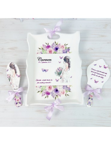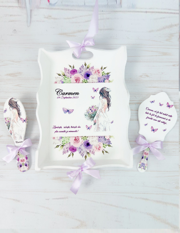 Descopera Setul Gatit Mireasa personalizat, un cadou unic si elegant, perfect pentru orice mireasa. Complet realizat manual in atelierul nostru, acest set este compus din trei piese esentiale: o tava, o oglinda de mana si o perie, toate fabricate din lemn sau MDF de cea mai buna calitate. Fiecare piesa este vopsita si lacuita manual cu mare atentie la detalii, folosind vopsea acrilica non-toxica pe baza de apa si lac rezistent, garantand astfel durabilitatea si un finisaj impecabil.