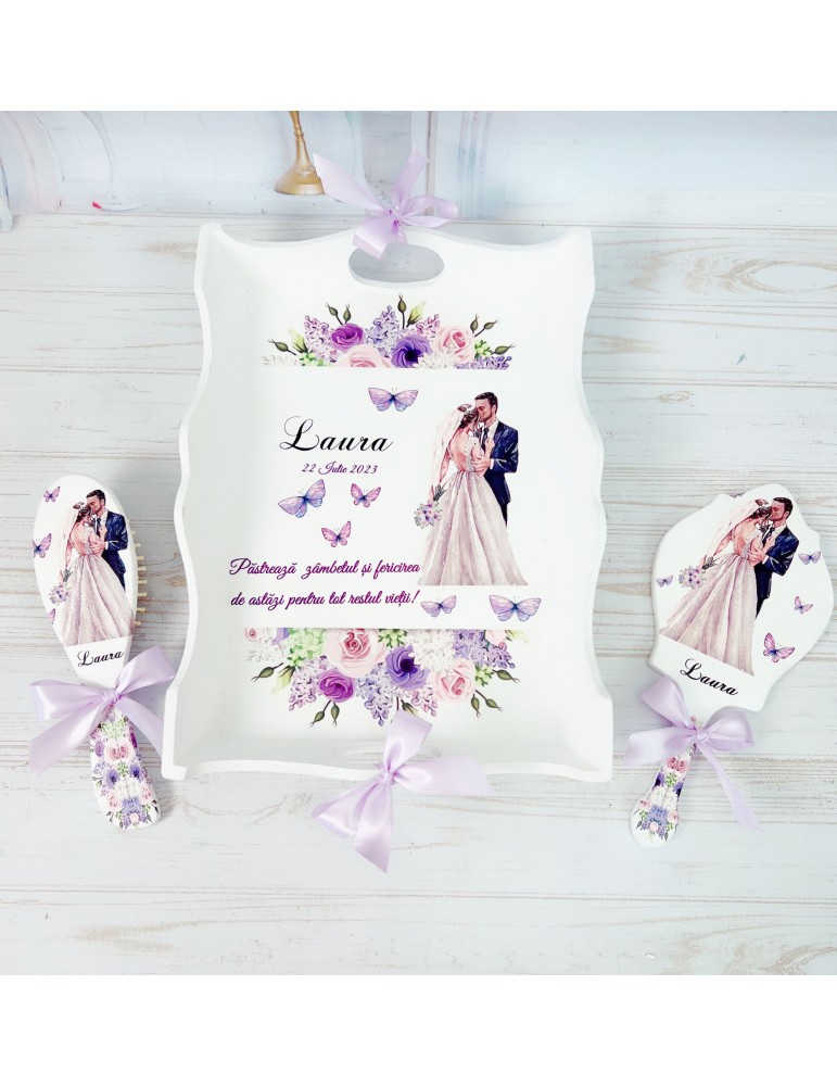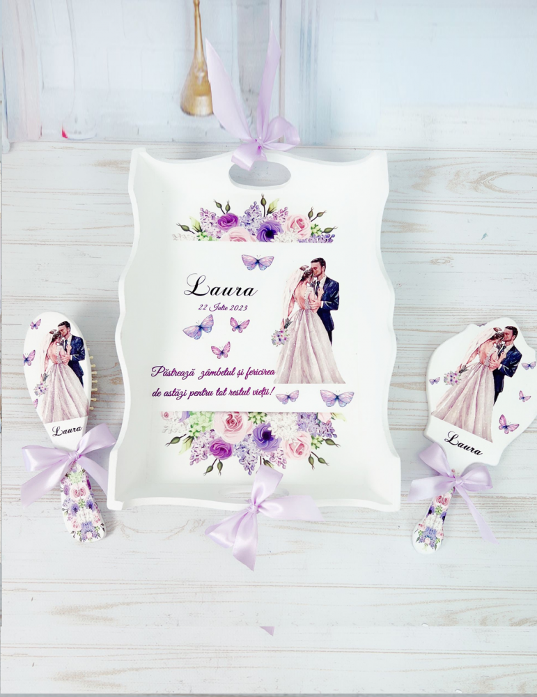 Descopera Setul Gatit Mireasa personalizat, un cadou unic si elegant, perfect pentru orice mireasa. Complet realizat manual in atelierul nostru, acest set este compus din trei piese esentiale: o tava, o oglinda de mana si o perie,  toate fabricate din lemn sau MDF de cea mai buna calitate. Fiecare piesa este vopsita si lacuita manual cu mare atentie la detalii, folosind vopsea acrilica non-toxica pe baza de apa si lac rezistent, garantand astfel durabilitatea si un finisaj impecabil.