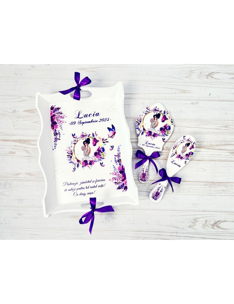 Descopera Setul Gatit Mireasa personalizat, un cadou unic si elegant, perfect pentru orice mireasa. Complet realizat manual in atelierul nostru, acest set este compus din trei piese esentiale: o tava, o oglinda de mana si o perie, toate fabricate din lemn sau MDF de cea mai buna calitate. Fiecare piesa este vopsita si lacuita manual cu mare atentie la detalii, folosind vopsea acrilica non-toxica pe baza de apa si lac rezistent, garantand astfel durabilitatea si un finisaj impecabil.