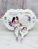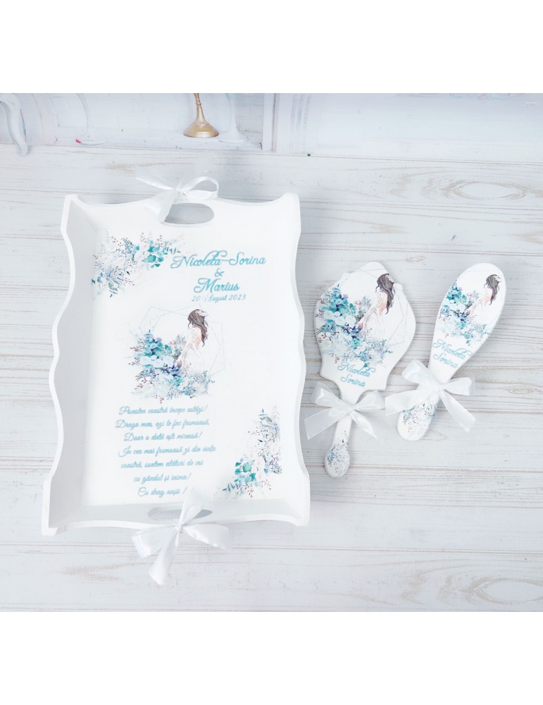 Descopera Setul Gatit Mireasa personalizat, un cadou unic si elegant, perfect pentru orice mireasa. Complet realizat manual in atelierul nostru, acest set este compus din trei piese esentiale: o tava, o oglinda de mana si o perie, toate fabricate din lemn sau MDF de cea mai buna calitate. Fiecare piesa este vopsita si lacuita manual cu mare atentie la detalii, folosind vopsea acrilica non-toxica pe baza de apa si lac rezistent, garantand astfel durabilitatea si un finisaj impecabil.