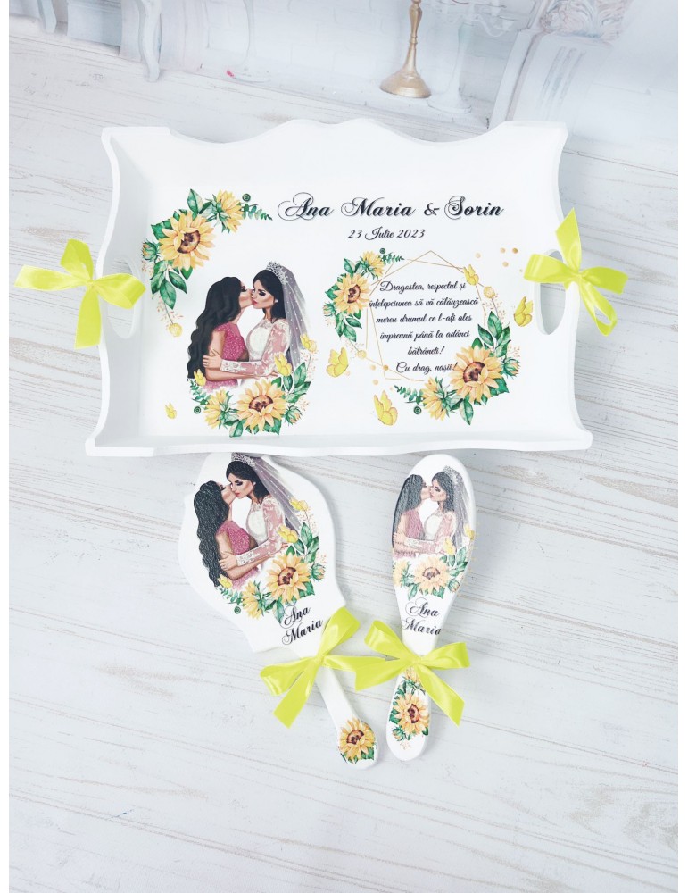 Descopera Setul Gatit Mireasa personalizat, un cadou unic si elegant, perfect pentru orice mireasa. Complet realizat manual in atelierul nostru, acest set este compus din trei piese esentiale: o tava, o oglinda de mana si o perie, toate fabricate din lemn sau MDF de cea mai buna calitate. Fiecare piesa este vopsita si lacuita manual cu mare atentie la detalii, folosind vopsea acrilica non-toxica pe baza de apa si lac rezistent, garantand astfel durabilitatea si un finisaj impecabil.