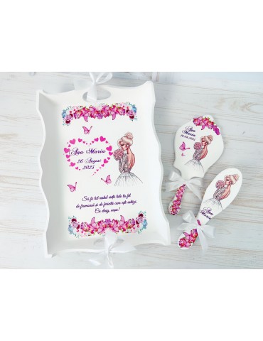 Descopera Setul Gatit Mireasa personalizat, un cadou unic si elegant, perfect pentru orice mireasa. Complet realizat manual in atelierul nostru, acest set este compus din trei piese esentiale: o tava, o oglinda de mana si o perie, toate fabricate din lemn sau MDF de cea mai buna calitate. Fiecare piesa este vopsita si lacuita manual cu mare atentie la detalii, folosind vopsea acrilica non-toxica pe baza de apa si lac rezistent, garantand astfel durabilitatea si un finisaj impecabil.
