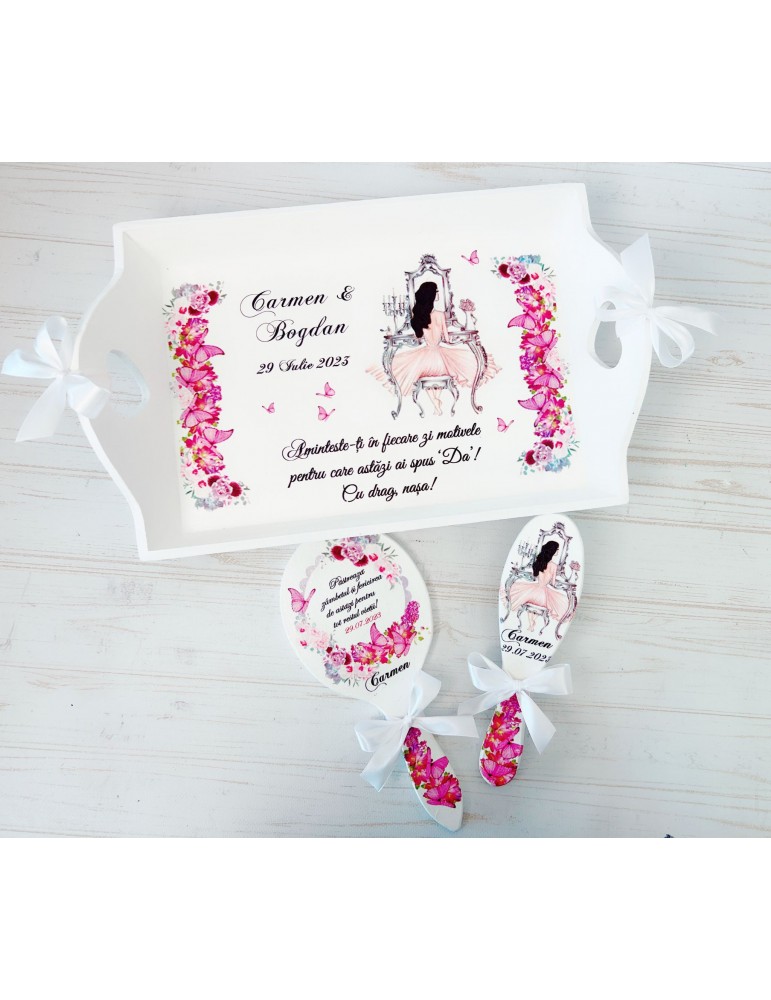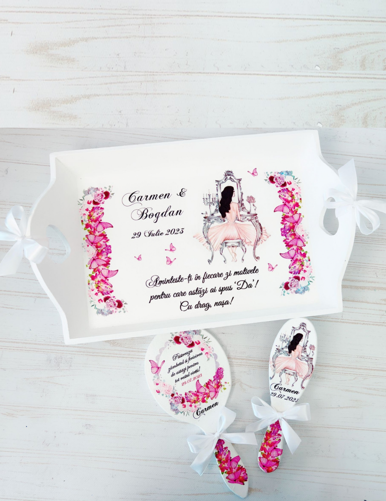 Descopera Setul Gatit Mireasa personalizat, un cadou unic si elegant, perfect pentru orice mireasa. Complet realizat manual in atelierul nostru, acest set este compus din trei piese esentiale: o tava, o oglinda de mana si o perie, toate fabricate din lemn sau MDF de cea mai buna calitate. Fiecare piesa este vopsita si lacuita manual cu mare atentie la detalii, folosind vopsea acrilica non-toxica pe baza de apa si lac rezistent, garantand astfel durabilitatea si un finisaj impecabil.