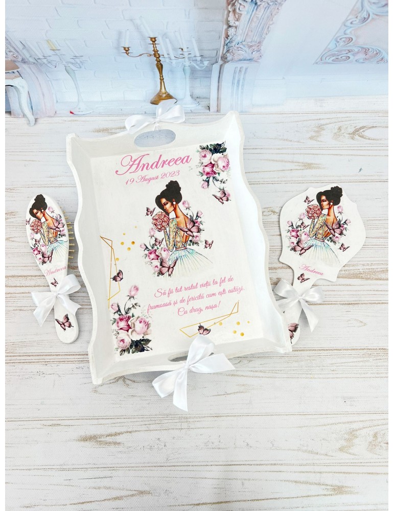 Descopera Setul Gatit Mireasa personalizat, un cadou unic si elegant, perfect pentru orice mireasa. Complet realizat manual in atelierul nostru, acest set este compus din trei piese esentiale: o tava, o oglinda de mana si o perie,  toate fabricate din lemn sau MDF de cea mai buna calitate. Fiecare piesa este vopsita si lacuita manual cu mare atentie la detalii, folosind vopsea acrilica non-toxica pe baza de apa si lac rezistent, garantand astfel durabilitatea si un finisaj impecabil.